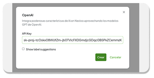 En el campo API KEY , pegue la clave generada en OpenAI. Haga clic en “Crear” .